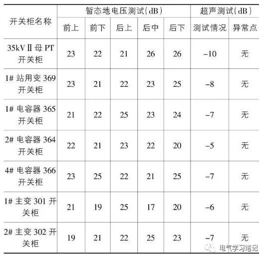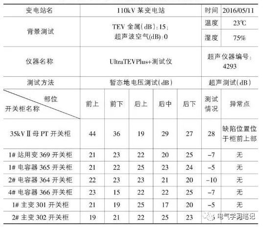 2016年5月11日,當(dāng)操作人員檢查一個(gè)110千伏變電站35kV的高壓室時(shí),他們聽到輕微的間歇放電噪音。通知維護(hù)人員后,測(cè)試人員趕到現(xiàn)場(chǎng),使用了UltraTEVPlus+測(cè)試儀。對(duì)電壓為11+35千伏和0+的110千伏高壓室進(jìn)行了瞬態(tài)地電壓試驗(yàn)(TEV)和超聲波局部放電試驗(yàn)(兩種檢測(cè)方法的數(shù)據(jù)如下表所示)。