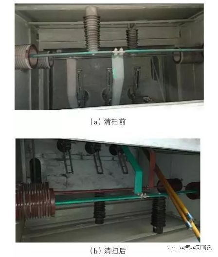 通過瞬態(tài)地電壓和超聲波兩種測(cè)試方法,對(duì)發(fā)現(xiàn)的缺陷進(jìn)行了處理。經(jīng)確認(rèn),110kv 變電站35kVⅱ母線PT開關(guān)柜上層母線倉(cāng)積有嚴(yán)重污染。主要原因是前幾天的降雨導(dǎo)致母線排a相支柱絕緣子受潮,導(dǎo)致絕緣性能下降,從而導(dǎo)致局部放電故障的發(fā)生。