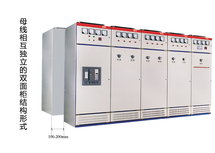 獨立總線的雙面機柜結構實質上是將兩組背靠背機柜安裝在一起,兩組開關柜的后部一般相隔100-200毫米,作為總線系統(tǒng)的散熱通道。