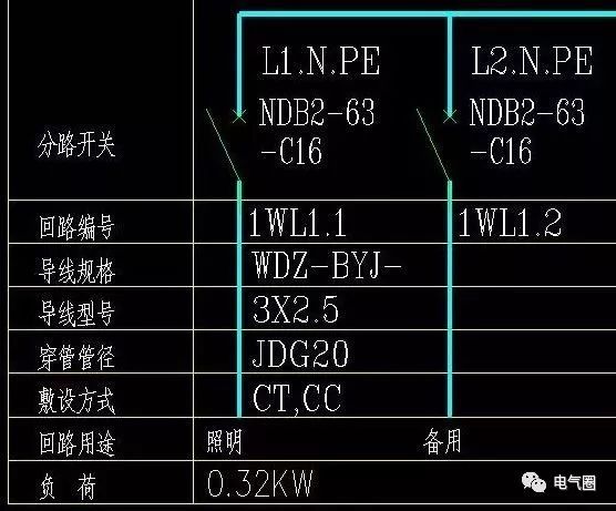 L1。并聯(lián)開關(guān)上方的N.PE表示通過從火線的三相中選擇一相,并添加零線和地線,形成一個(gè)具有220伏電源的1WL1.1回路。導(dǎo)線規(guī)格WDZ-BYJ-3X2.JDG20-CT,CC指低煙無鹵阻燃交聯(lián)聚乙烯絕緣(銅芯)導(dǎo)線,3根2.5平方毫米,直徑20毫米的金屬管,橋架及沿屋面暗敷設(shè)。同時(shí),標(biāo)記該回路用于照明和備用。照明負(fù)載為0.32千瓦,相對較小。