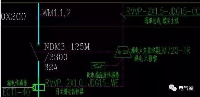 圖紙這一部分的信息量也相對較大,所以要盡量詳細(xì)。Wm1.1,2表示它由1.1環(huán)和1.2環(huán)繪制,在上層總照明配電箱;額定電流為32A的NDM125M/3300 32A斷路器;ECT40是一個(gè)電子傳感器。確切的名稱應(yīng)該是剩余電流互感器。根據(jù)前面的電流計(jì)算,選擇63A或100A的剩余電流互感器就足夠了。其工作原理是檢測火線和零線(零線)的電流矢量之和,并計(jì)算電流損耗,即漏電。配電箱溫度傳感器是電氣火災(zāi)監(jiān)控系統(tǒng)中檢測配電箱箱溫度、溫度和漏電的標(biāo)準(zhǔn)箱。EM720-1R是一種電氣火災(zāi)探測器,用于向電氣火災(zāi)監(jiān)控設(shè)備(主機(jī))傳輸泄漏信息、溫度信息和報(bào)警信息。使用rvp-2X1.jdg 1cc,即2X1.5平方毫米屏蔽軟線,天花板中隱藏一根直徑為15毫米的金屬管。