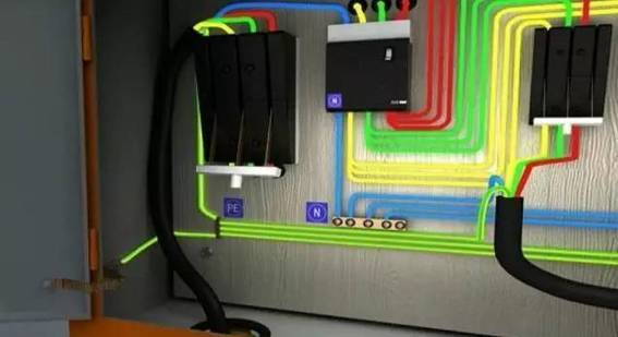 1.黃色、綠色和紅色(A、B和C)三相線分別從總配電箱的配電開關(guān)引出,淺藍(lán)色工作零線從工作零線引出,黃綠色雙色PE保護(hù)零線從PE端子引出。