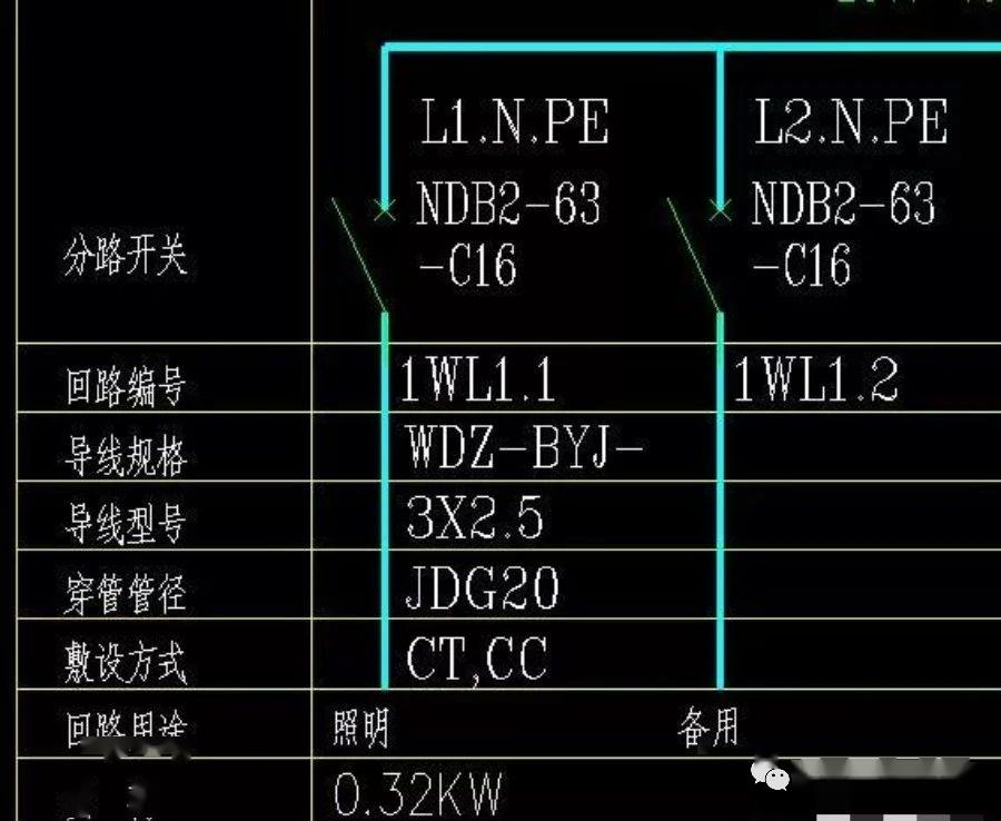 L1。并聯(lián)開關(guān)上方的N.PE指的是采用一路帶電導(dǎo)線,即三項中的一項,加上零線和地線,形成一個1WL1.1回路,電源電壓為220伏。導(dǎo)線規(guī)格WDZ-BYJ-3X2.JDG20-CT,CC指低煙無鹵阻燃交聯(lián)聚乙烯絕緣(銅芯)導(dǎo)線,3根2.5平方毫米,直徑20毫米的金屬管,橋架及沿屋面暗敷設(shè)。同時,標(biāo)記該回路用于照明和備用。照明負(fù)載為0.32千瓦,相對較小。